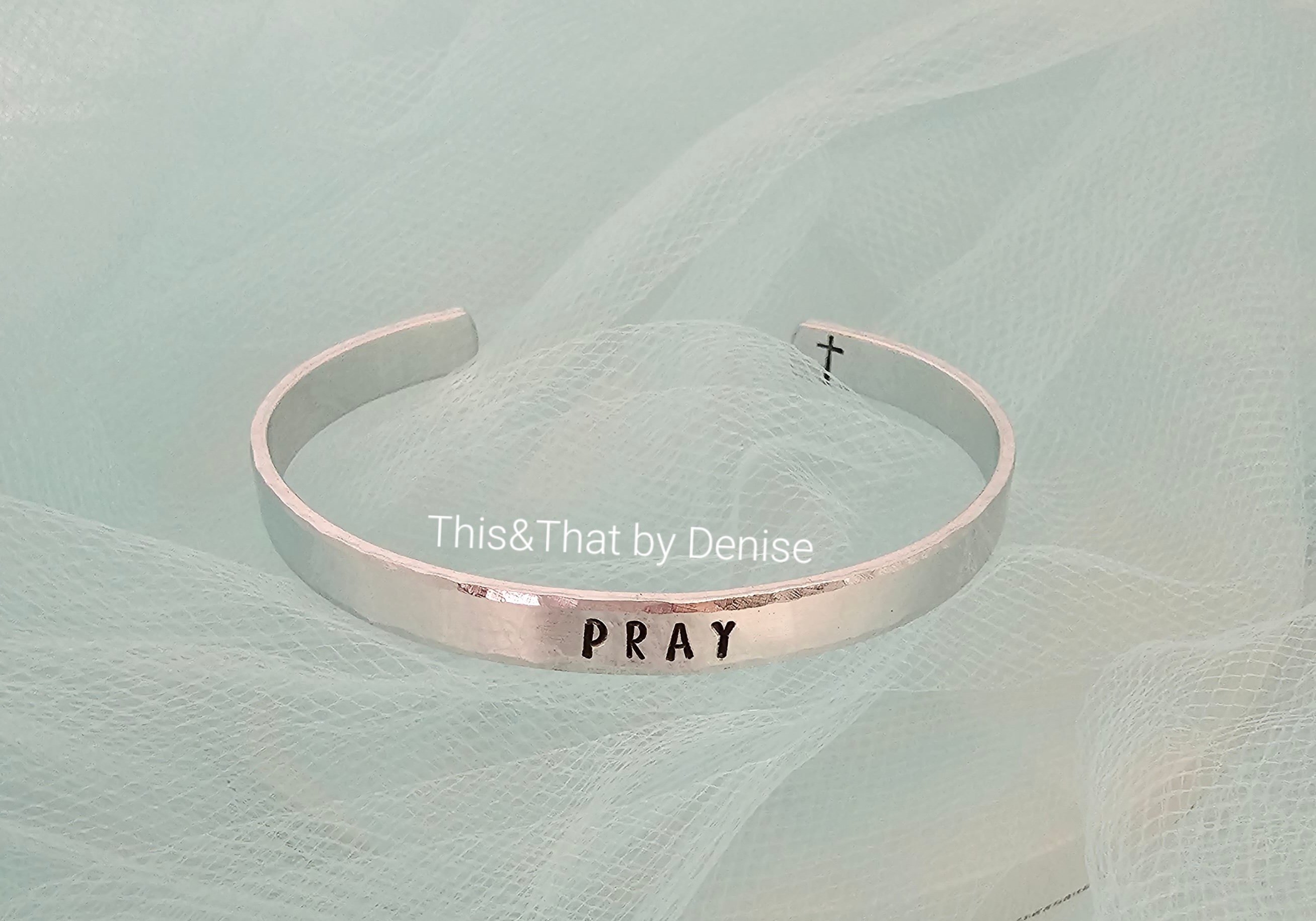 Aluminum cuff style bracelet with the word PRAY on the outside of the bracelet and a cross stamped on the inside. The edges of the bracelet are hammered. This piece is hand stamped and formed. This bracelet is 1/4" wide and fits an average size wrist.